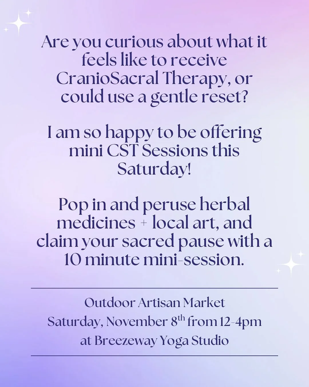 With an intuitive and grounded approach, I use CranioSacral Therapy, Clinical Hypnosis, and Vibrational Medicine techniques that are designed to address limiting physical, energetic, and emotional patterns stored in the body. This work is intended to regulate your Nervous System, liberate outdated coping mechanisms, and integrate resonance so that you can circle into your own center and feel at home within yourself.