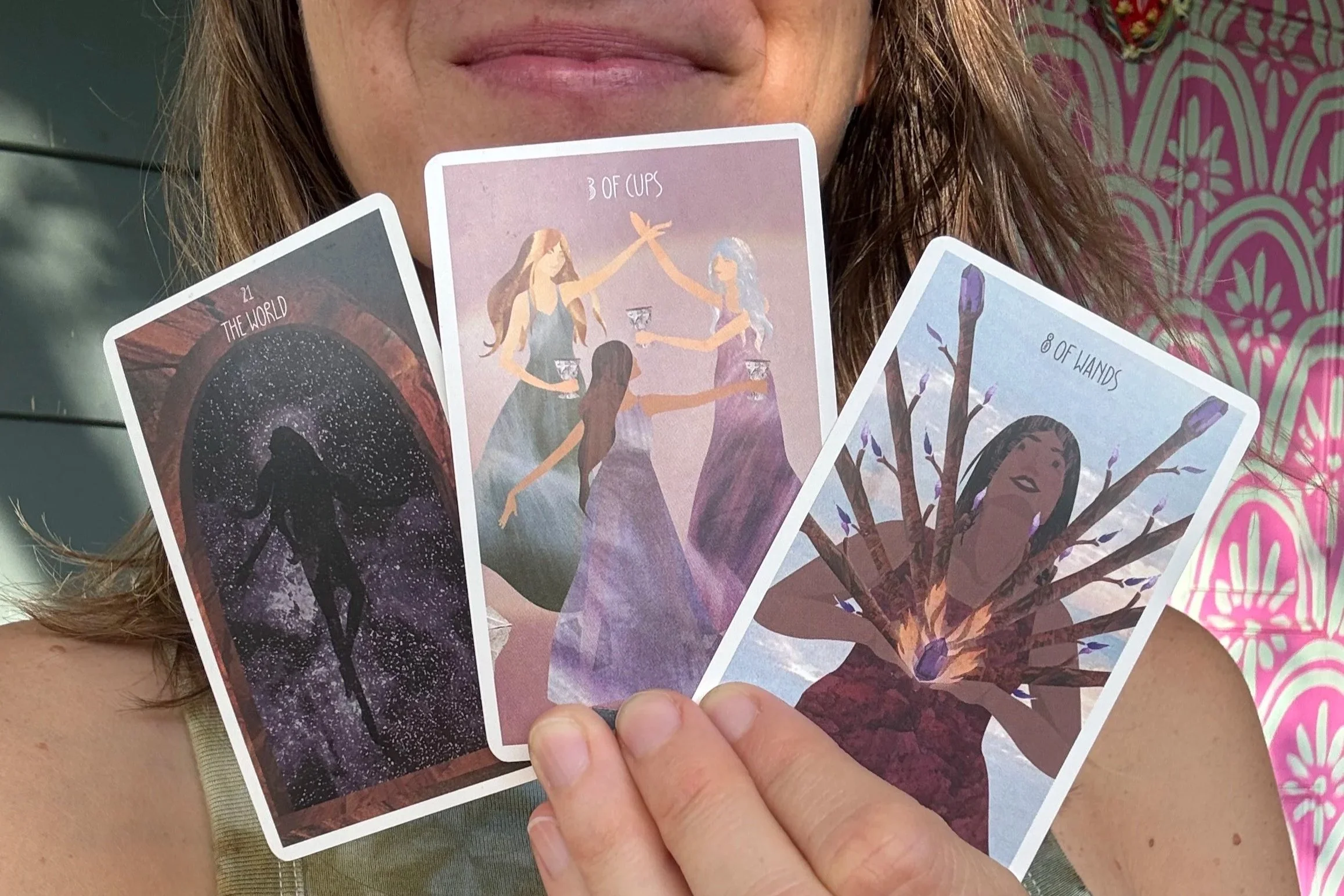 This month I pulled three cards: The World (reversed), 3 of Cups (reversed), and 8 of Wands (reversed). I kind of love that they all came through reversed. If you’ve received readings from me before, you know I often interpret reversals as internal rather than external. This feels like a deeply personal month of growth. And when we alchemize our own wounds into wisdom, the ripple effect into the collective is powerful, healing, and hopeful.